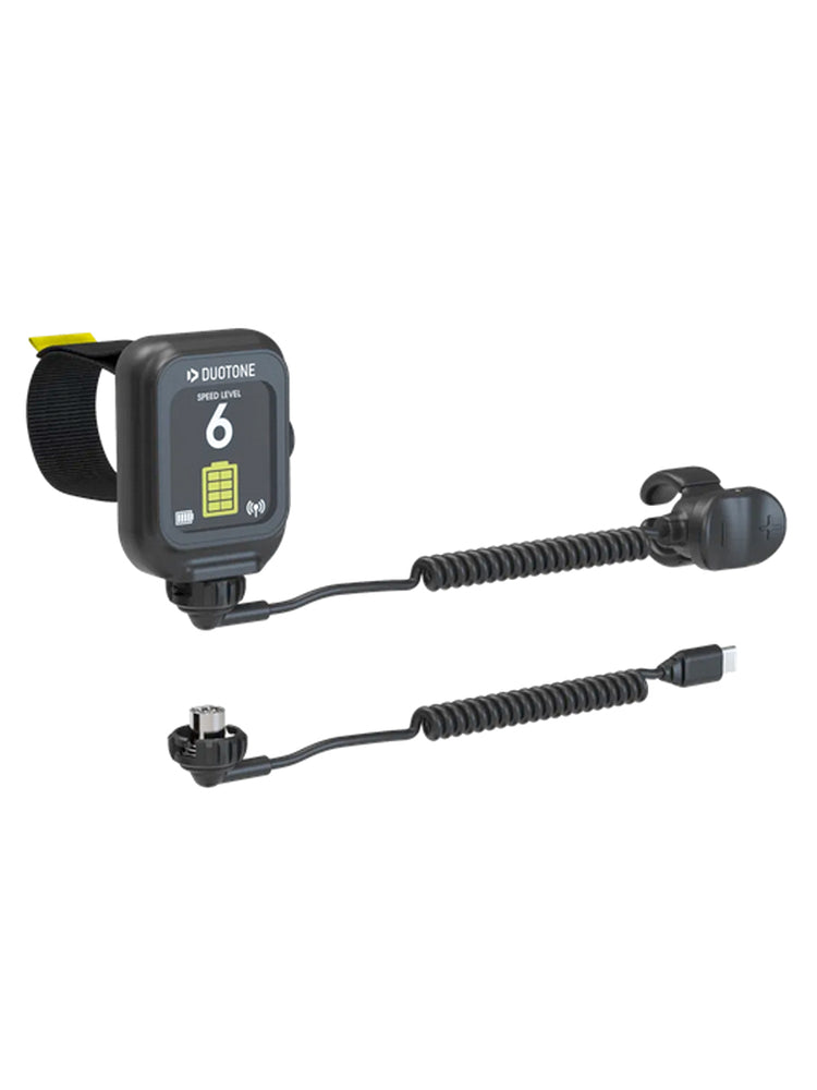 The Foil Assist Remote - a waterproof smartwatch-style controller with a finger ring - keeps your hands free, making it easier to paddle, or push up on the board. Activate the motor with a double-click on the + button, and control the speed by pressing and holding either the + or - button.