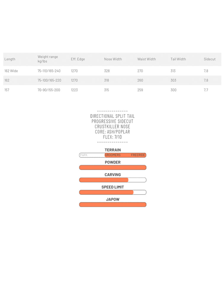 The Tree Surfer features a Swallow Tail that allows for better control in deep powder. The unique hammerhead-sharknose brings you next level riding even in thick crust. This is a board shaped to excel in variable conditions.