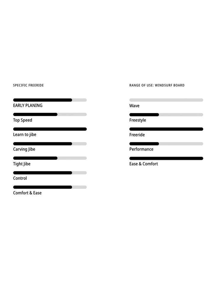 The true freerider: What is astonishing about this board line is its ease and smoothness. You’ll step on it and everything will happen naturally and predictably. The feel is “familiar” – like putting on an old pair of shoes: It just fits! Relaxed and confident you’ll achieve more speed than on previous generations of freeride boards. Despite these easy-riding characteristics, performance and agility are not compromised at all. British WINDSURF once stated that the biggest surprise was its speed and that its performance is comfortable if not exceptional. The hull feels quick, lively and responsive. Planing readily, it provides traction which inspires you to push your fun and adrenaline and to let the board fly on its fin – in control!