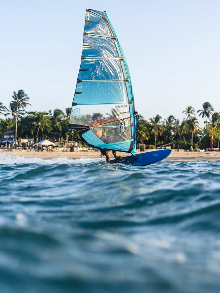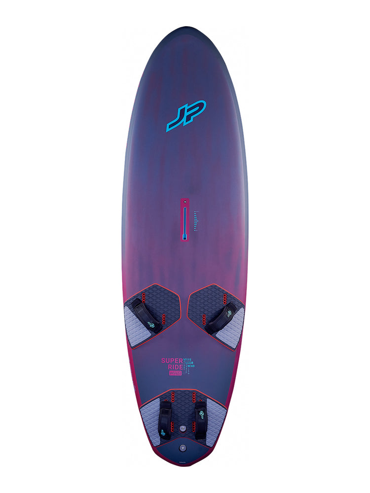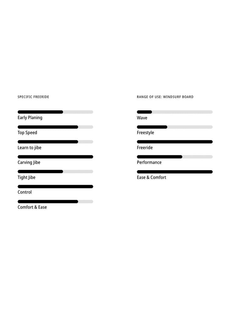 The Super Ride features a wider tail and overall width, creating a stable platform with a big planing area. This design, combined with an efficient rocker line, supports early planing and ensures smooth performance in different conditions. The shape reduces drag and improves efficiency, allowing the board to plane in a higher water position for a smooth ride and consistent control, even in choppy water. This balance of stability and responsiveness enables confident acceleration and high-speed windsurfing.