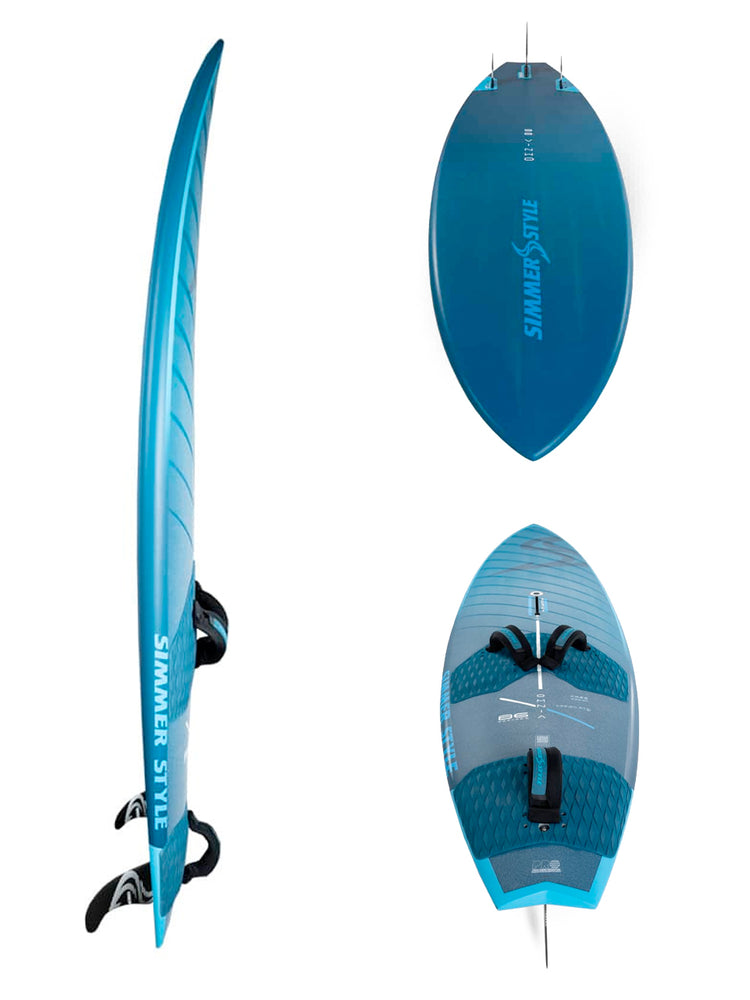 When thinking about ideas for the new Simmer Freewave board, we had our team riders raving about the combination of speed and control of this bottom profile on our minds and decided to base our new freewave development on it. After some iterations, we ended up with a swallow tail outline with a relatively wide and stable nose and a curvature distribution that keeps the tail relatively straight for added grip. Interestingly, now the development went in the other direction, and the outline from the production prototypes was brought over to the to the 75-liter pro model version that is now a part of the production lineup, sporting five slot boxes. The rest of the lineup uses the exact same bottom shape and progressively slightly fuller rails on the bigger models. Except for the 75, all sizes have a center powerbox and slot box thruster boxes.