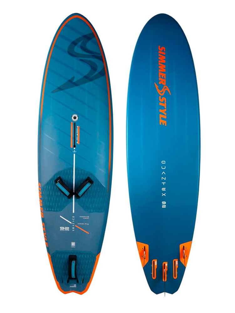 The central challenge for wind swell performance wave boards is to, provide tight turning board in smaller waves and control bigger waves, which in wind swell locations means chop and high wind. In the Quantex, the mechanism for solving this problem lies in the outline. By fitting a relatively low curvature central outline into a relatively short package, we have achieved to combine stability at high speeds speed with agility at lower speeds. A slighly wider tail that is finished in a jet tail, that is a swallow with the corners chamfered off, provides an excellent platform for early planing and for carrying speed through the bottom turn when winds and waves proves less drive.
