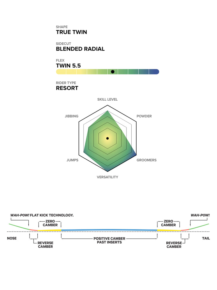 Our RESORT V1 Profile boards take full advantage of the benefits of traditional camber, zero camber, and reverse camber. This next generation design allows you to get the pop and response of a cambered board with all the predictability and easy turn initiation of zero camber or reverse camber shapes.