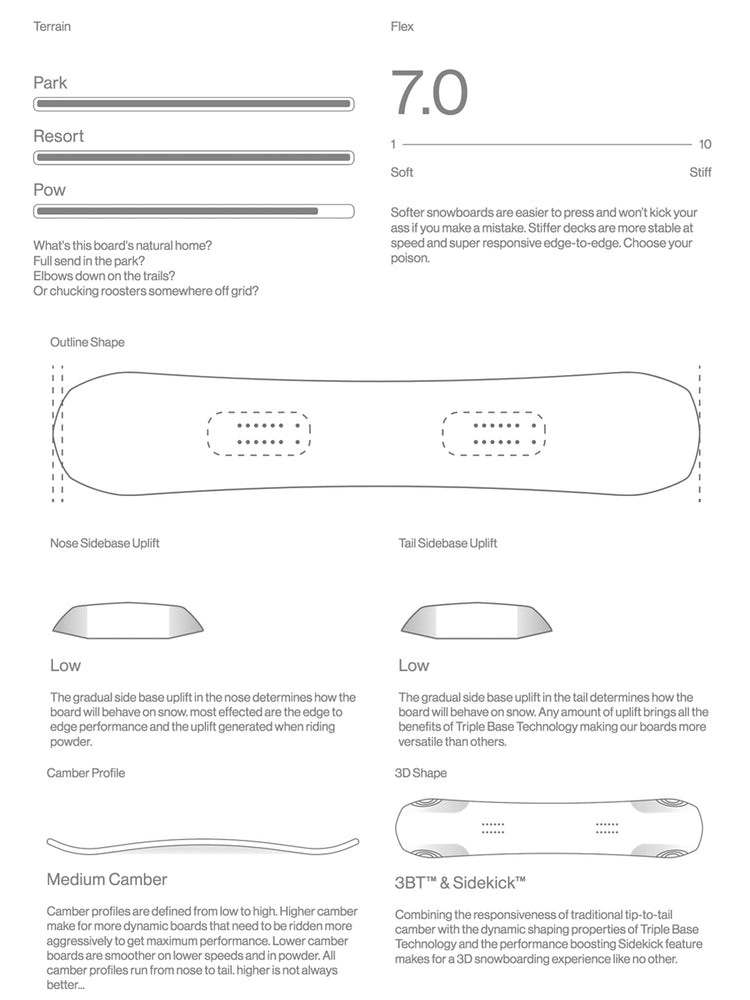 At the heart of every Bataleon is a combination of 3BT™ and positive camber. It’s an innovative solution to the profile puzzle that minimizes the potential for edge-catch without sacrificing ollie power or carving performance. From this starting point, we fine-tune each element according to the boards desired riding style.
