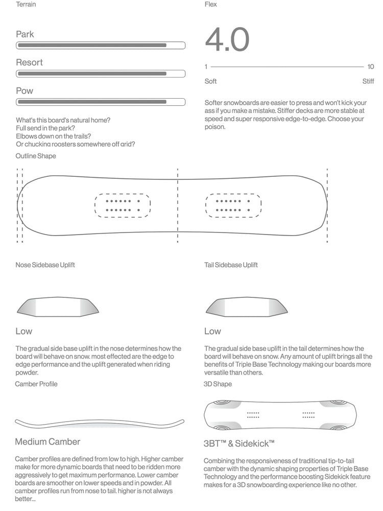 At the heart of every Bataleon is a combination of 3BT™ and positive camber. It’s an innovative solution to the profile puzzle that minimizes the potential for edge-catch without sacrificing ollie power or carving performance. From this starting point, we fine-tune each element according to the boards desired riding style.